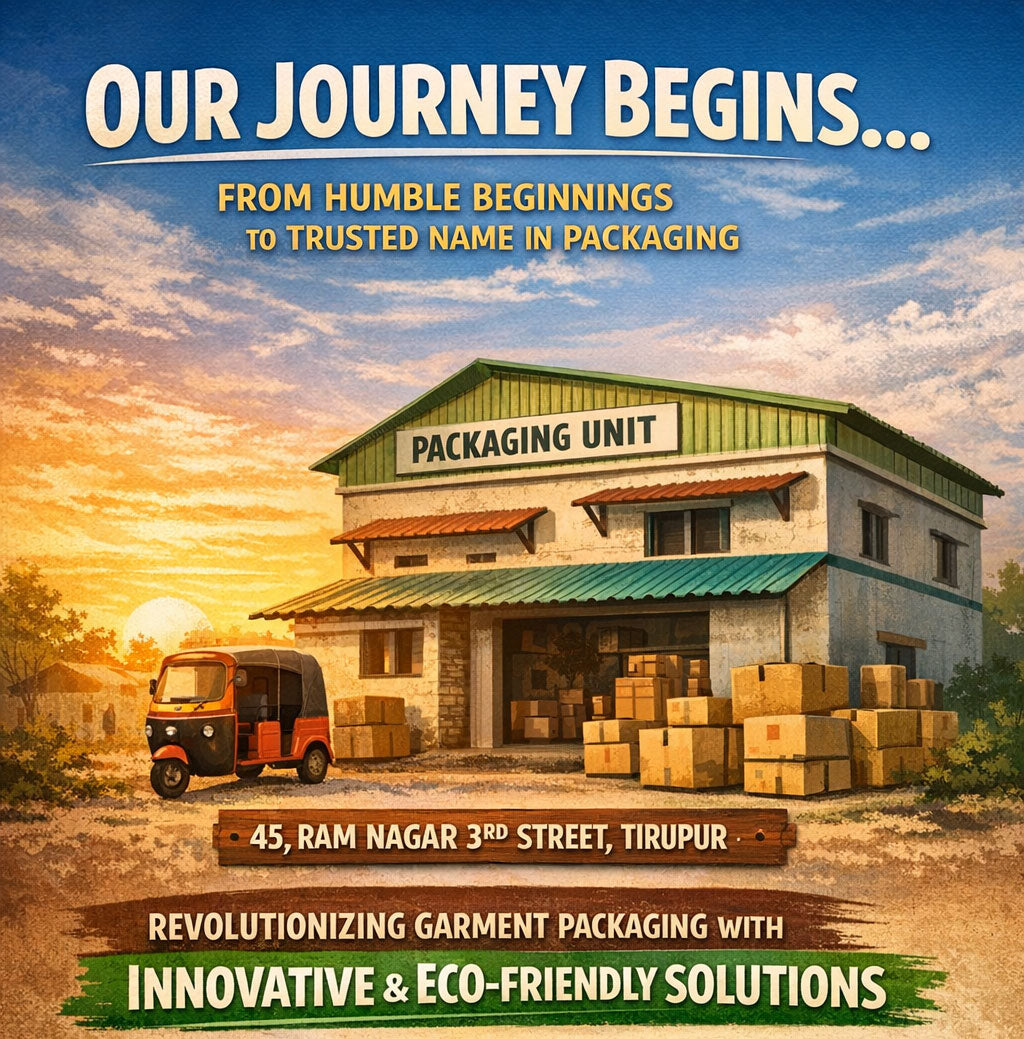 Founded with a vision to provide durable and reliable packaging, we have grown into a trusted name in the industry. Our journey began in a modest facility on 45, Ram Nagar 3rd Street, Tirupur, where we set out to revolutionize garment packaging with innovative and eco-friendly solutions.